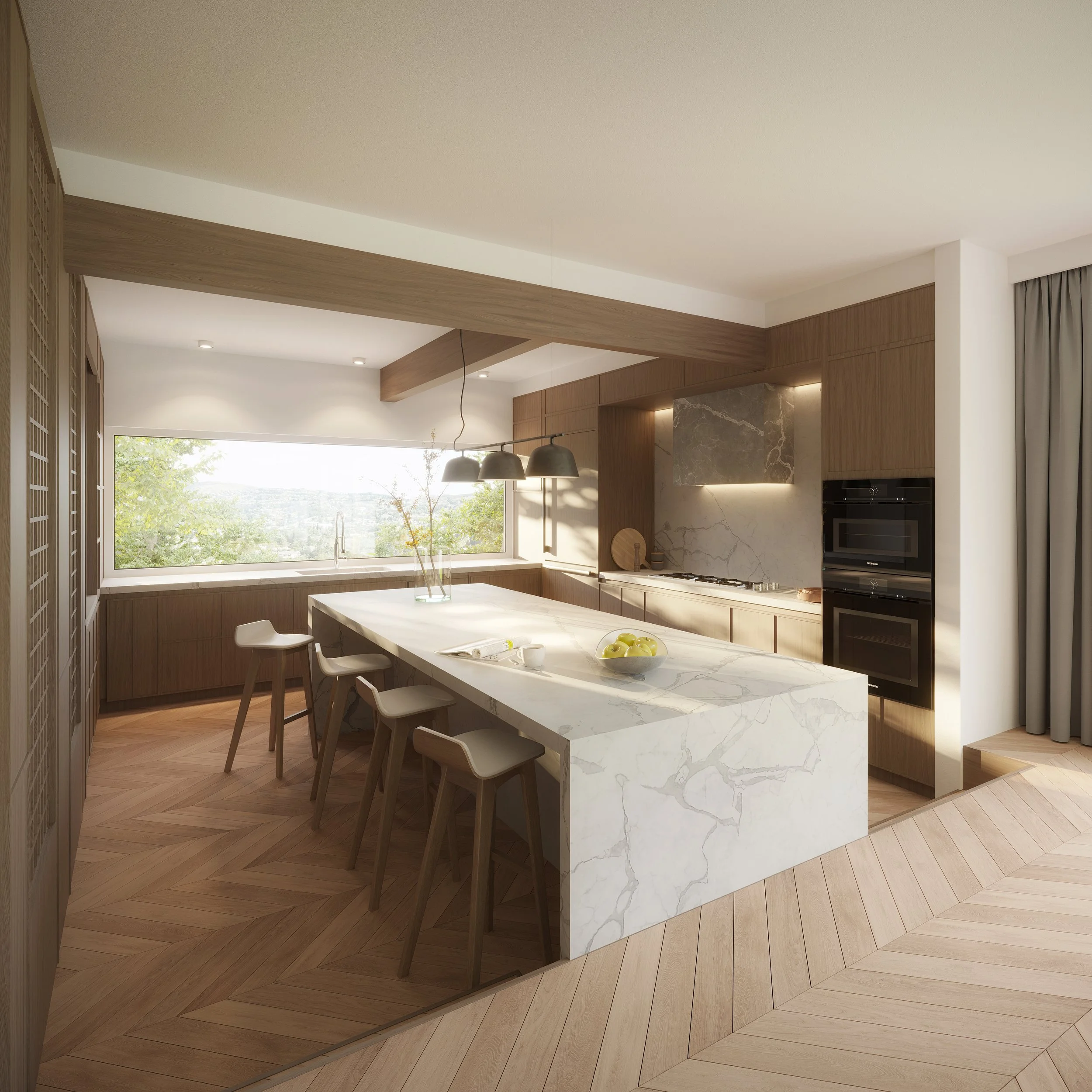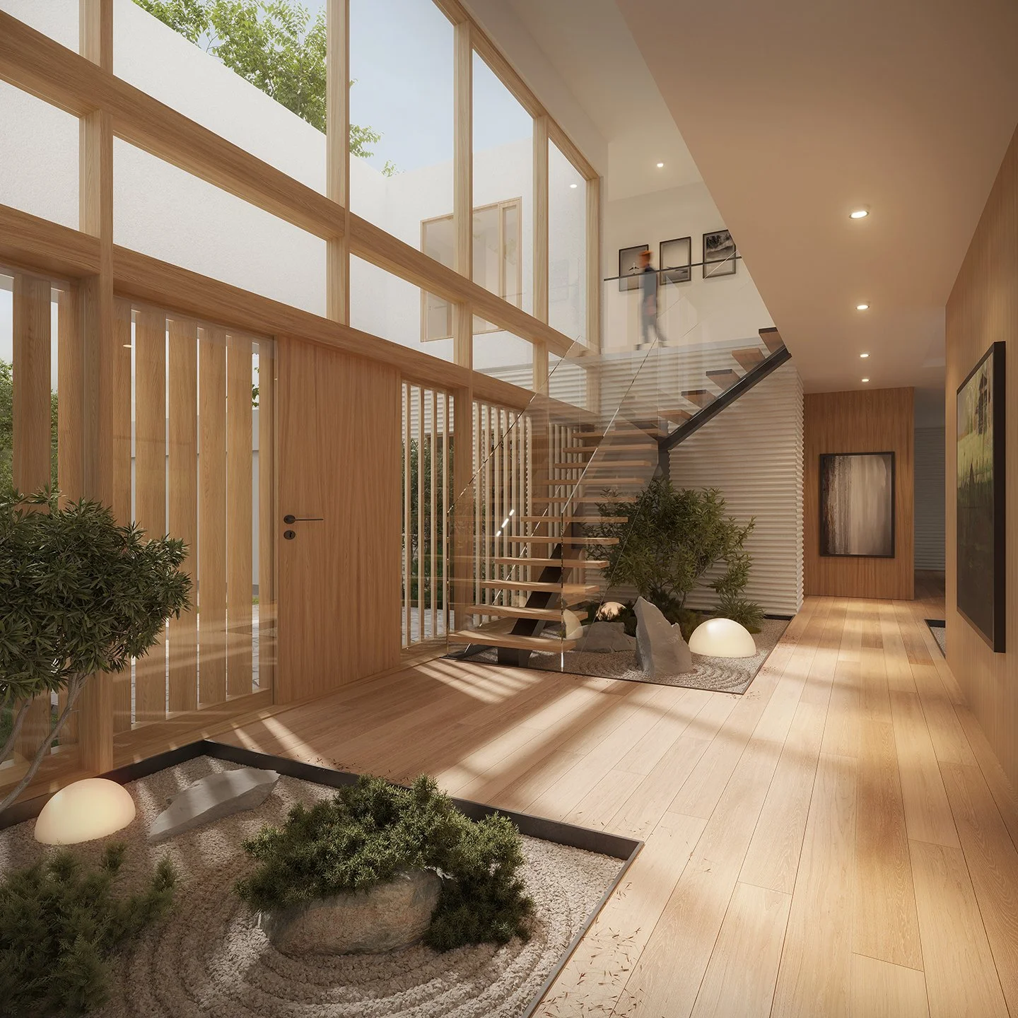 The new residence is composed of interlocking volumes that echo the original layout. The entry opens into a tranquil Japanese–style courtyard, framed by floating beams that cast shifting patterns of light and shade. Slatted wood panels, inspired by traditional Japanese screens, filter sunlight into the space. Here, as throughout the entire home, the feeling is a balance of serenity and security for a new phase of family life.